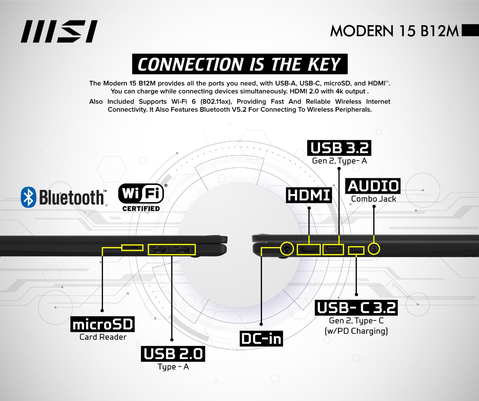 The Modern 15 B12M provides all the ports you need, with USB-A, USB-C, microSD, and HDMI™. You can charge while connecting devices simultaneously. HDMI 2.0 with 4k output .