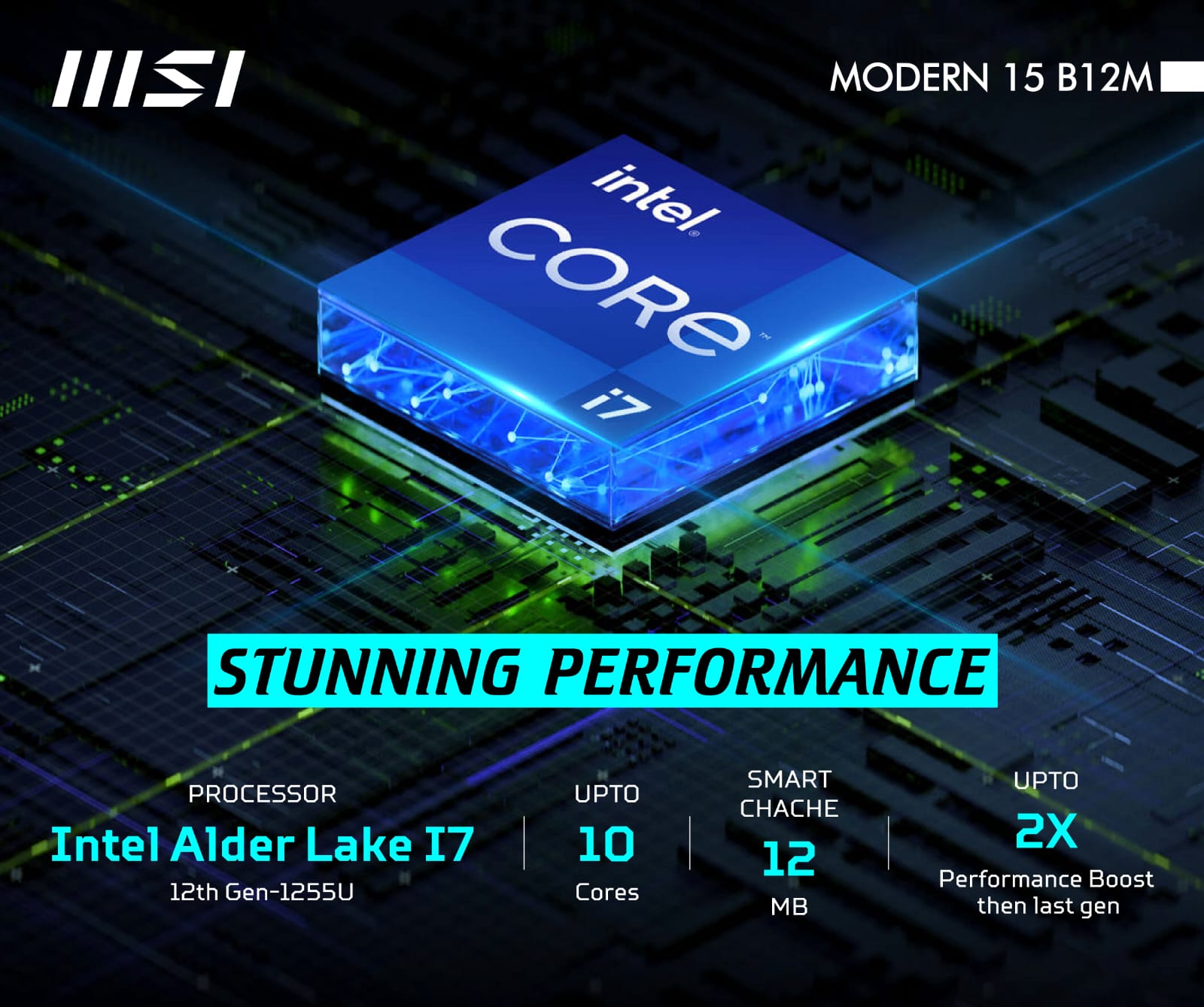 Intel Alder Lake I7 12th Gen-1255U Processor with Up to 10 Cores with max turbo frequency 4.40 GHz With 12 MB Intel® Smart Cache for smooth performance for productivity and work. Up to 2X Performance Boost than previous gen Intel® Core™ i7-1165G7 processors